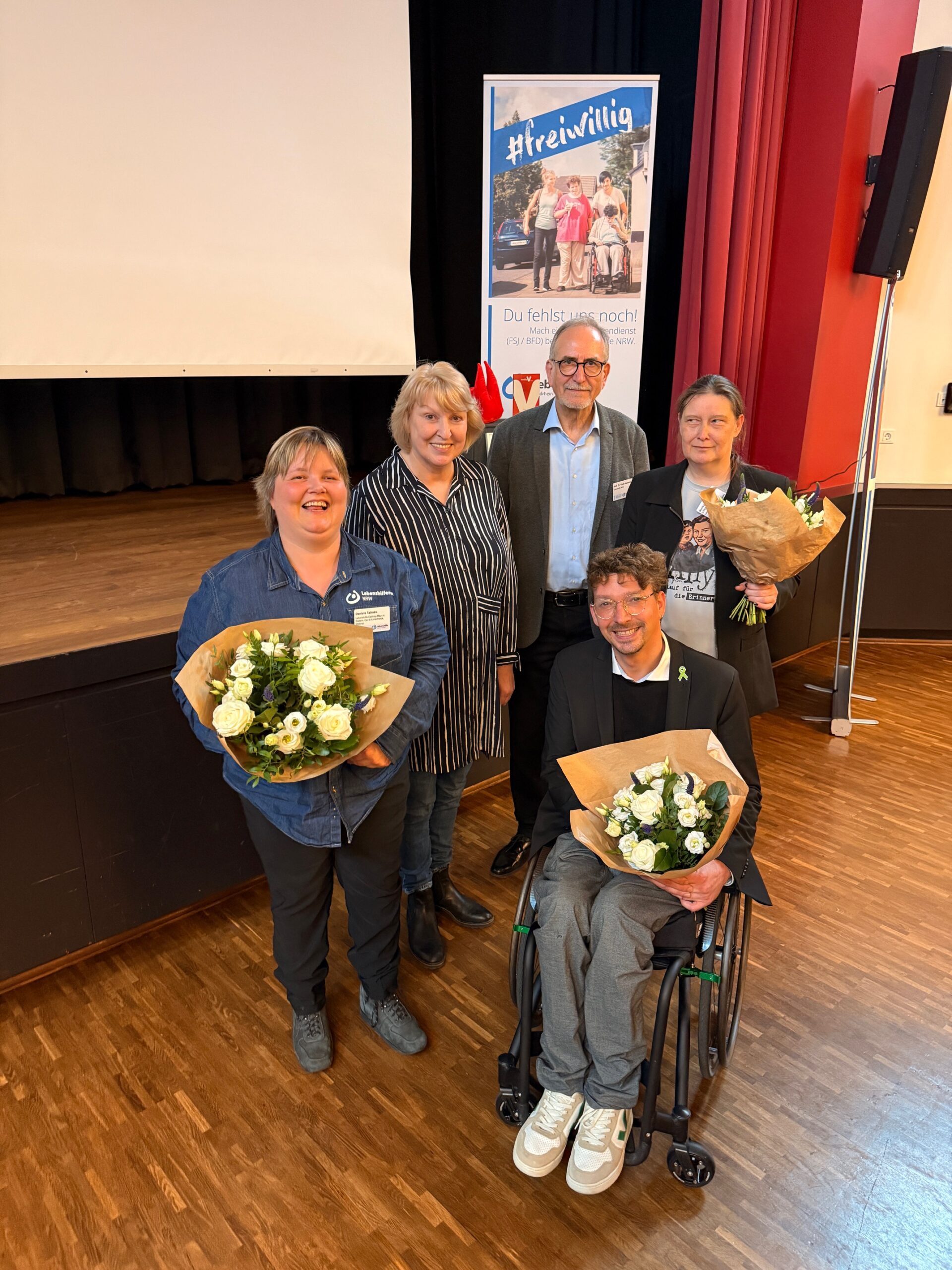 Bildbeschreibung: Man sieht fünf Menschen vom Vorstand der Lebenshilfe NRW mit Blumensträußen. Im Hintergrund ist ein Aufsteller der Lebenshilfe NRW mit der Aufschrift „#freiwillig“